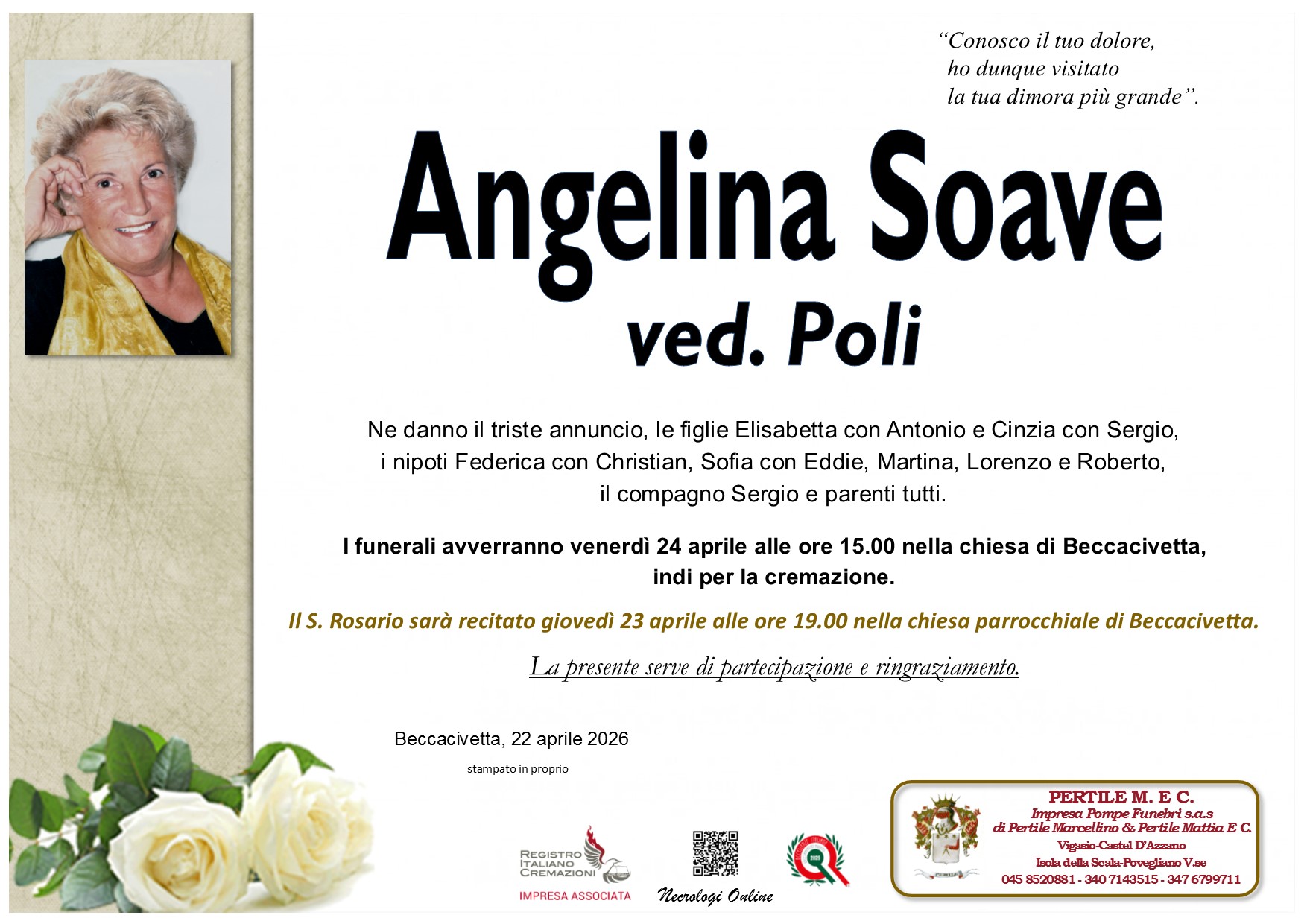 Moreno Pertile “Quando cadono le foglie nel tramonto restano soltanto i ricordi felici ed il rimpianto di una vita trascorsa; noi siamo gli amici umili e silenziosi e vorremmo talvolta non esserci se la vita non richiedesse la nostra presenza.” Ricordiamo i nostri cari Necrologi Online Bottoni Barbara Entra nel necrologio Perinelli Gemma Entra nel necrologio Leoni Luigi Entra nel necrologio Load more